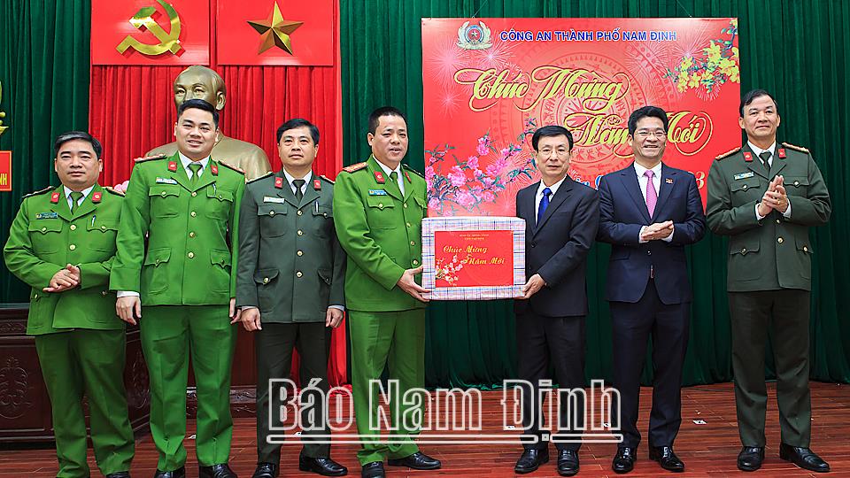 Đến thăm cán bộ, chiến sĩ Công an tỉnh và Công an thành phố Nam Định, đồng chí Chủ tịch UBND tỉnh đã ghi nhận, biểu dương kết quả của lực lượng Công an tỉnh năm 2022 trong thực hiện nhiệm vụ bảo đảm an ninh chính trị, trật tự an toàn xã hội; đồng thời thực hiện tốt nhiệm vụ "tuyến đầu" trong công tác phòng, chống dịch COVID-19. Đồng chí Chủ tịch UBND tỉnh chúc Tết cán bộ, chiến sĩ Công an tỉnh và đề nghị lực lượng Công an tỉnh nỗ lực, phấn đấu, quyết tâm hoàn thành xuất sắc các nhiệm vụ được giao, trước mắt là giữ vững an ninh, an toàn đêm Giao thừa và những ngày Tết cổ truyền của dân tộc, góp phần mang lại bình yên cho nhân dân vui Tết, đón Xuân.