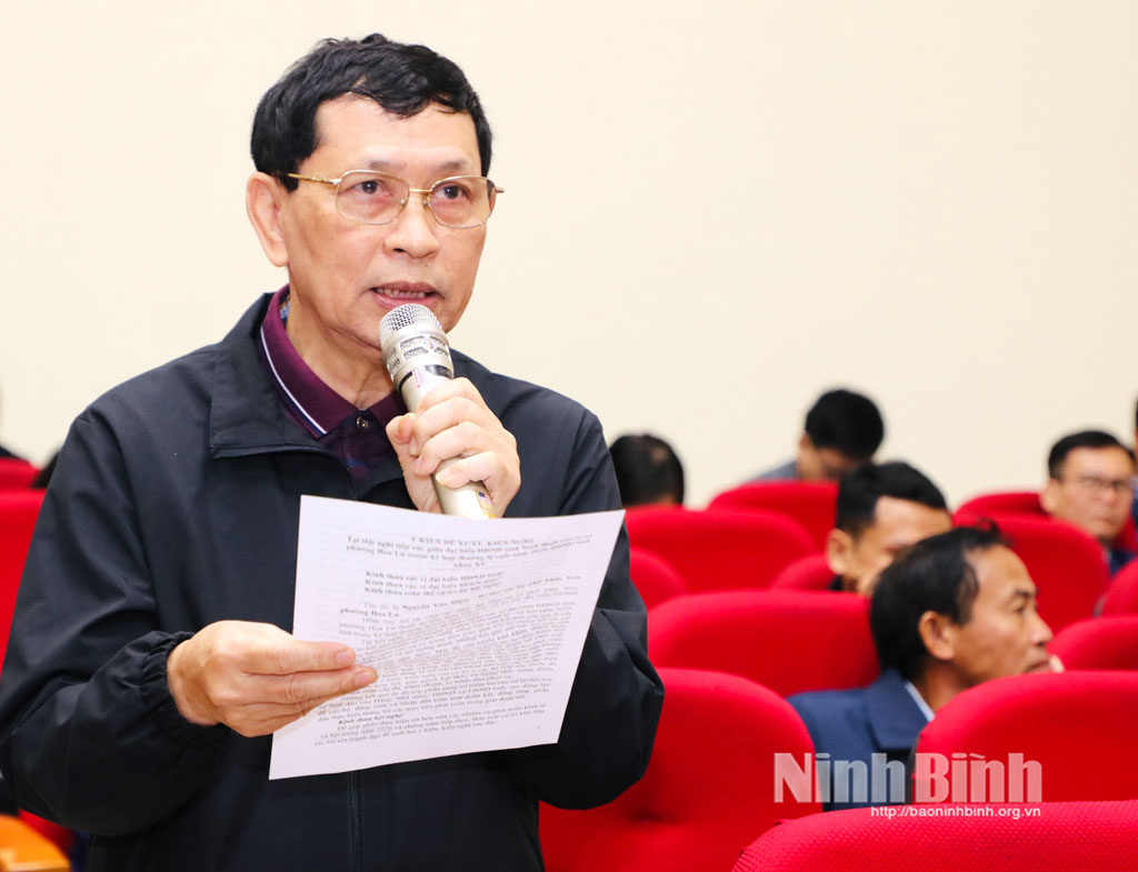 Tại hội nghị, 13 đại biểu cử tri đã phát biểu kiến nghị 27 nhóm vấn đề thiết thực liên quan đến đời sống người dân. Các ý kiến cử tri đề nghị tỉnh chỉ đạo các đơn vị có liên quan kiểm tra kết nối giữa Ngân hàng và Cổng dịch vụ công Quốc gia giúp việc thanh toán trực tuyến của cá nhân, tổ chức thuận tiện hơn; Đề nghị tỉnh sớm ban hành các quy định về chính sách hỗ trợ cho nhân lực công nghệ thông tin, chuyển đổi số. Đề nghị cấp có thẩm quyền có chính sách đặc thù cho nhân dân nằm trong vùng quy hoạch chung xây dựng quần thể Danh thắng Tràng An; đầu tư xây dựng, nâng cấp tuyến đường giao thông điểm đầu Quốc lộ 38 ngã ba Anh Trỗi đi Trường Yên điểm cuối giáp đường Du lịch Động Thiên Hà, dài 2,8 km hiện đã xuống cấp nghiêm trọng, gây mất an toàn, khó khăn cho việc đi lại của nhân dân, nhất là các cháu học sinh; Đề nghị tỉnh hỗ trợ cấp kinh phí hoạt động cho các Tổ dân phố hàng năm. Một số ý kiến cử tri đề nghị các cấp, các ngành quan tâm nhiều hơn đến công tác giải phóng mặt bằng; quản lý vệ sinh môi trường; mở rộng khuôn viên các trường học; tổ chức thi tuyển giáo viên; xây dựng thêm các thiết chế văn hóa, thể thao; tăng cường quản lý hàng giả, hàng kém chất lượng…