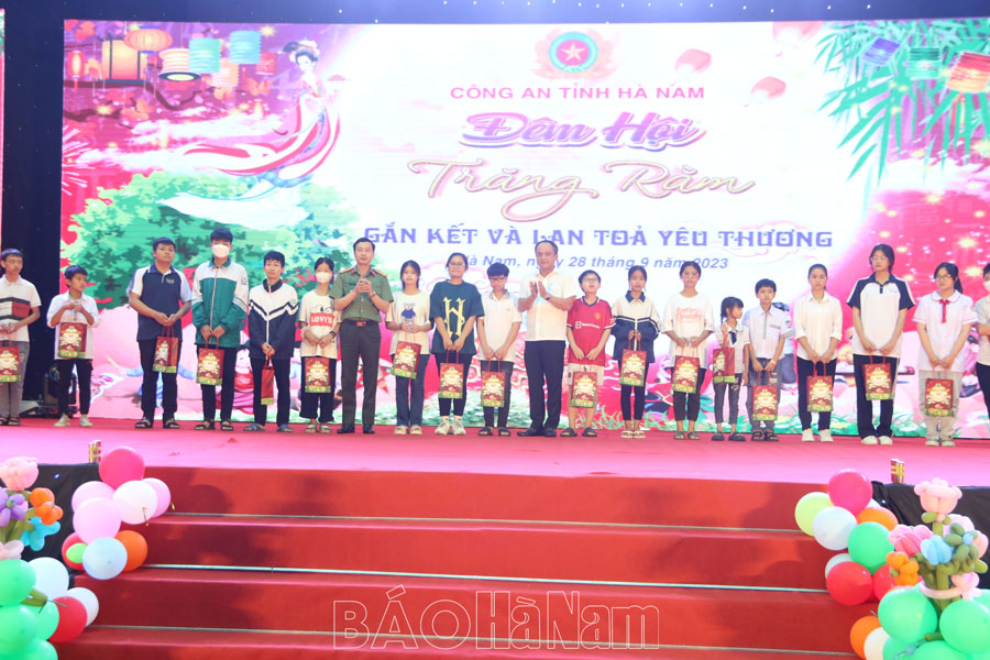 Trong chương trình Đêm hội trăng rằm hôm nay, Công an tỉnh dành tặng nhiều phần quà ý nghĩa để ghi nhận, động viên các cháu tiếp tục phấn đấu vươn lên đạt nhiều thành tích cao hơn nữa trong năm học tới. Hy vọng chương trình Đêm hội trăng rằm sẽ thật sự trở thành nơi gắn kết và lan tỏa yêu thương giữa cán bộ, chiến sĩ Công an tỉnh Hà Nam với toàn thể nhân dân và các cháu thiếu nhi trong toàn tỉnh, là món quà tinh thần ý nghĩa mà Công an tỉnh dành tặng các cháu trong dịp Tết Trung thu 2023.