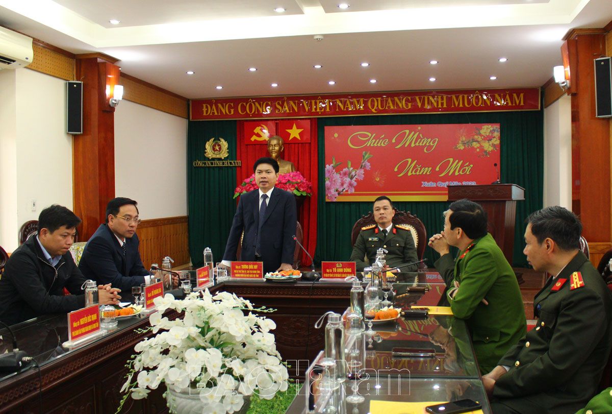 Nhân dịp chuẩn bị đón Tết Nguyên đán Quý Mão 2023, sáng 19/1, đồng chí Trương Quốc Huy, Phó Bí thư Tỉnh ủy, Chủ tịch UBND tỉnh, Trưởng đoàn Đại biểu Quốc hội tỉnh đã đến thăm, chúc Tết và kiểm tra tình hình trực tết tại Công an tỉnh, Công ty Cổ phần Môi trường và Công trình đô thị Hà Nam, Công ty Cổ phần Nước sạch Hà Nam. Cùng đi có đồng chí Đặng Thanh Sơn, Ủy viên Ban Thường vụ Tỉnh ủy, Phó Chủ tịch Thường trực HĐND tỉnh; lãnh đạo Văn phòng UBND tỉnh, Văn phòng Đoàn Đại biểu Quốc hội và HĐND tỉnh.