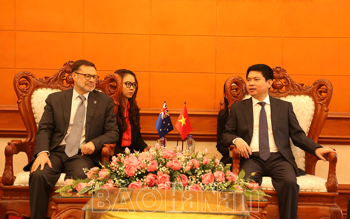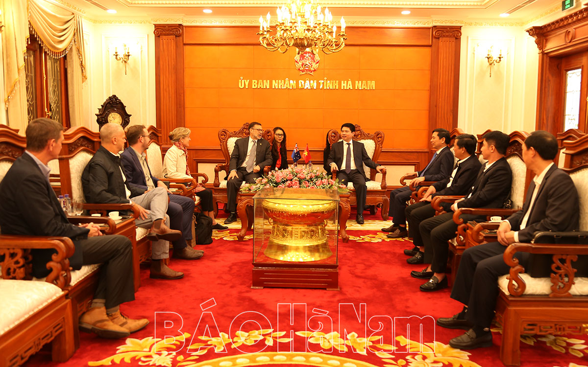 Trao đổi với Đoàn công tác, đồng chí Chủ tịch UBND tỉnh giới thiệu nhanh những tiềm năng, thế mạnh của tỉnh Hà Nam. Đồng chí Chủ tịch UBND tỉnh mong muốn các nhà đầu tư của Australia nghiên cứu, đầu tư vào Hà Nam ở ba lĩnh vực: Công nghiệp, nông nghiệp, phát triển thương mại dịch vụ và du lịch.