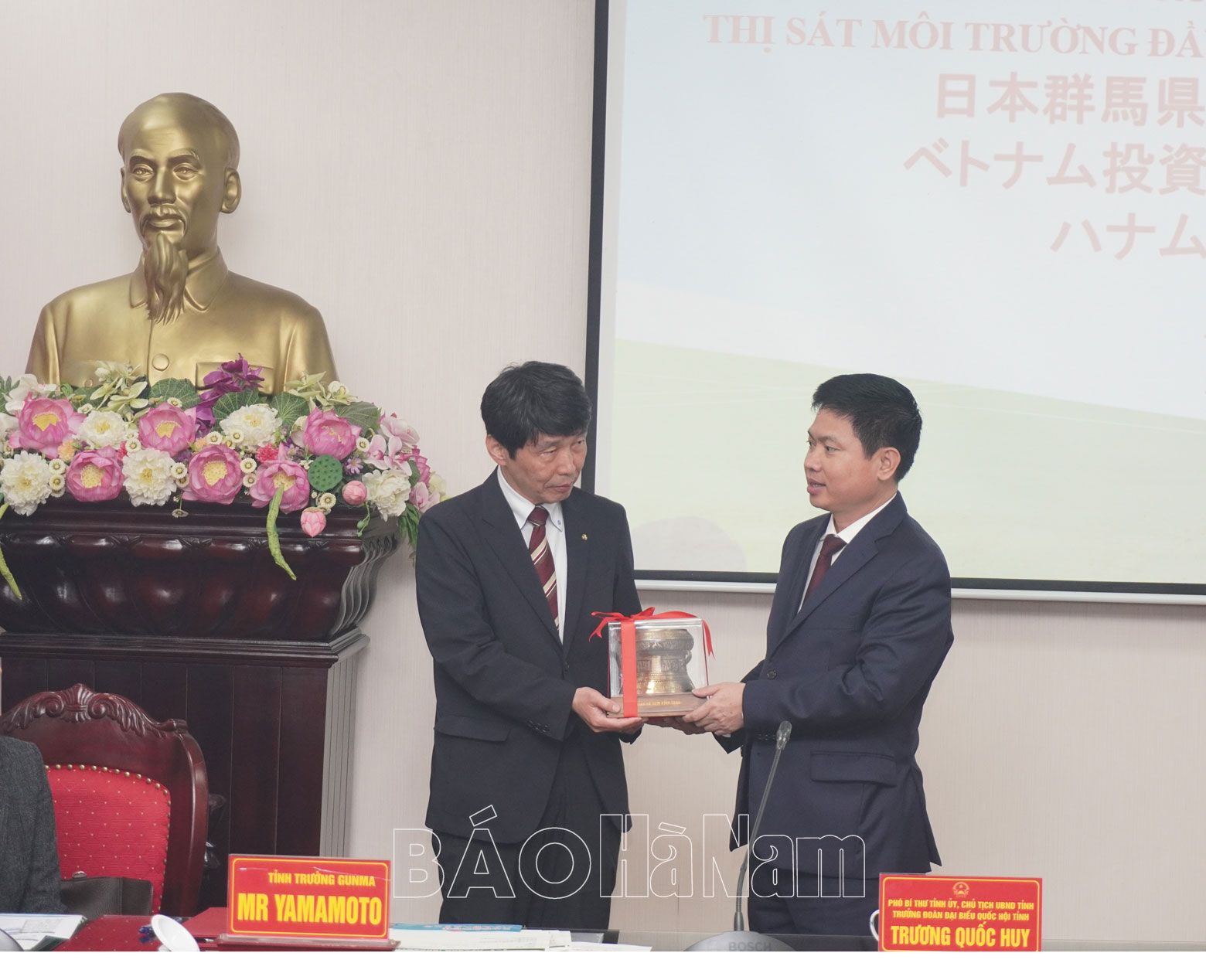 Đồng chí Trương Quốc Huy, Phó Bí thư Tỉnh ủy, Chủ tịch UBND tỉnh, Trưởng đoàn Đại biểu Quốc hội tỉnh trao tặng quà lưu niệm cho ngài ICHITA YAMAMOTO Tỉnh trưởng tỉnh Gunma.Các đồng chí lãnh đạo tỉnh Hà Nam và tỉnh Gunma chụp ảnh lưu niệm.