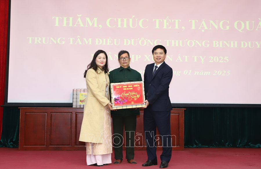 Nhân dịp Tết Nguyên đán Ất Tỵ 2025, chiều 15/1 đoàn lãnh đạo Tỉnh ủy, HĐND, UBND, Ủy ban MTTQ tỉnh do đồng chí Trương Quốc Huy, Phó Bí thư Tỉnh ủy, Chủ tịch UBND tỉnh, Trưởng Đoàn đại biểu Quốc hội tỉnh làm Trưởng đoàn đã đi thăm, chúc Tết Trung tâm điều dưỡng Thương binh Duy Tiên, tặng quà hộ nghèo, chúc thọ người cao tuổi của thị xã Duy Tiên. Cùng đi có đồng chí Trịnh Hồng Phong, Ủy viên Ban thường vụ Tỉnh ủy, Chỉ huy trưởng Bộ Chỉ huy Quân sự tỉnh; đại diện lãnh đạo một số sở, ban, ngành của tỉnh; Thị ủy, UBND thị xã Duy Tiên; Hiệp hội Doanh nghiệp tỉnh.