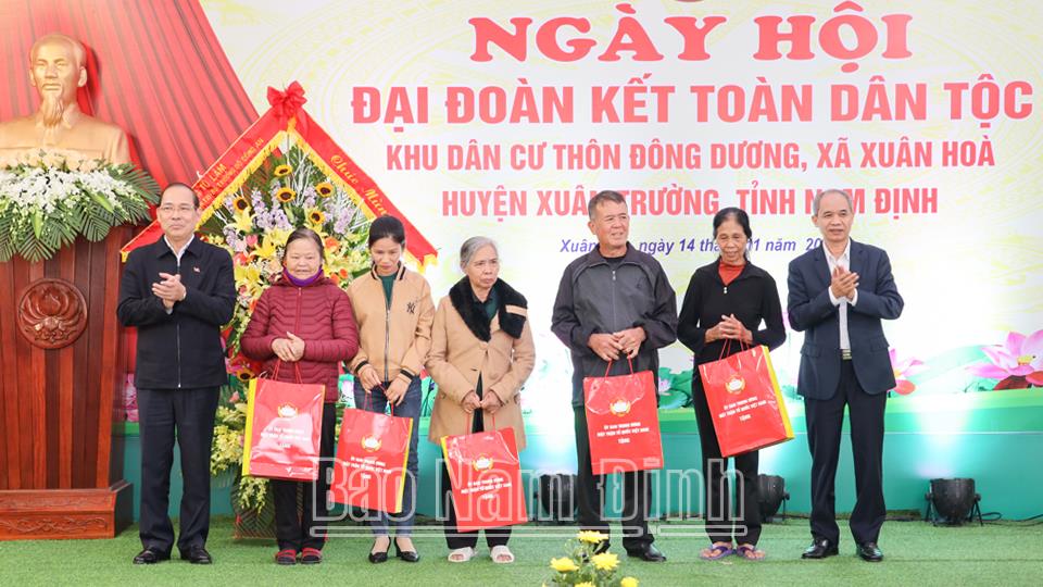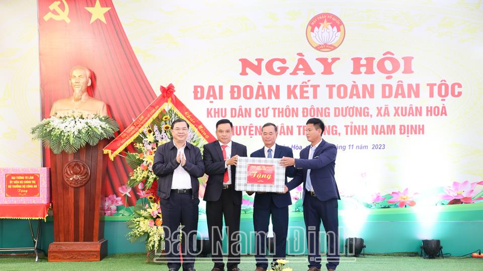 Nhân dịp này, đồng chí Đại tướng, Bộ trưởng Bộ Công an Tô Lâm đã tặng quà cho Giám mục Giáo phận Bùi chu Tôma Vũ Đình Hiệu; tặng quà cho Quỹ khuyến học xã Xuân Hòa và 6 tập thể, 20 cá nhân tiêu biểu ở thôn Đông Dương. Các đồng chí: Bí thư Tỉnh ủy Phạm Gia Túc; Phó Chủ tịch Ủy ban Trung ương MTTQ Việt Nam Hoàng Công Thủy; Phó Bí thư Thường trực Tỉnh ủy Lê Quốc Chỉnh và lãnh đạo HĐND, Ủy ban MTTQ tỉnh cũng tặng nhiều phần quà cho khu dân cư thôn Đông Dương và các hộ gia đình có hoàn cảnh khó khăn.