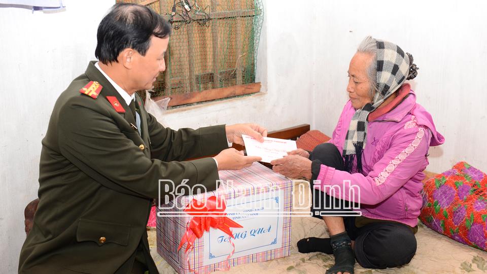 Đồng chí Giám đốc Công an tỉnh và lãnh đạo huyện Hải Hậu đã đến thăm hỏi, động viên, tặng quà Mẹ Việt Nam Anh hùng Bùi Thị Hiếm, 98 tuổi, ở xóm Chùa, xã Hải Phúc có 2 người con trai là liệt sĩ; ông Nguyễn Thanh Châu, 70 tuổi, là bệnh binh, thương binh ở xóm 4, xã Hải Xuân; bà Kim Thị Mai, 83 tuổi, đối tượng người cao tuổi cô đơn, hộ nghèo ở xóm Quang Phương, xã Hải Quang; bà Nguyễn Thị Thân, 66 tuổi, thuộc diện hộ nghèo không có khả năng lao động, có hoàn cảnh đặc biệt khó khăn ở xóm 9, xã Hải Anh; ông Nguyễn Xuân Bách, 75 tuổi, là thương binh, tỷ lệ 31%, ở xóm Xướng Chử, xã Hải Thanh.