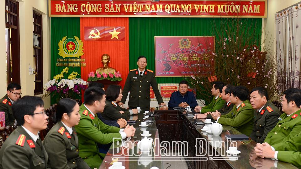 Nhân dịp này, đồng chí Giám đốc Công an tỉnh và lãnh đạo huyện Hải Hậu đã đến kiểm tra công tác thường trực sẵn sàng chiến đấu ở Công an huyện Hải Hậu. Các đồng chí lãnh đạo chúc mừng, ghi nhận và đánh giá cao những kết quả nổi bật mà cán bộ, chiến sĩ đơn vị đạt được trong năm 2022; yêu cầu thời gian tới Công an huyện Hải Hậu tiếp tục đoàn kết, khắc phục khó khăn, hoàn thành tốt các nhiệm vụ được giao, đóng góp quan trọng vào việc đảm bảo an ninh quốc gia, trật tự an toàn xã hội trên địa bàn, giữ vững bình yên để nhân dân đón Tết, vui Xuân an toàn, lành mạnh./.