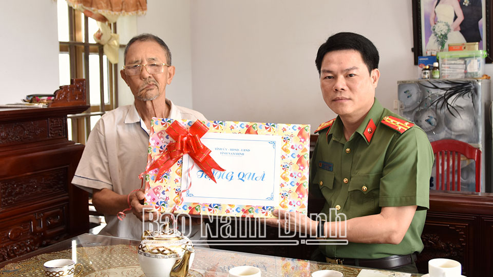 | Đồng chí Giám đốc Công an tỉnh Nguyễn Hữu Mạnh thăm, tặng quà ông Đào Văn Rạng, là thương binh 33%, ở tổ dân phố Tân Thọ, thị trấn Liễu Đề (Nghĩa Hưng). |