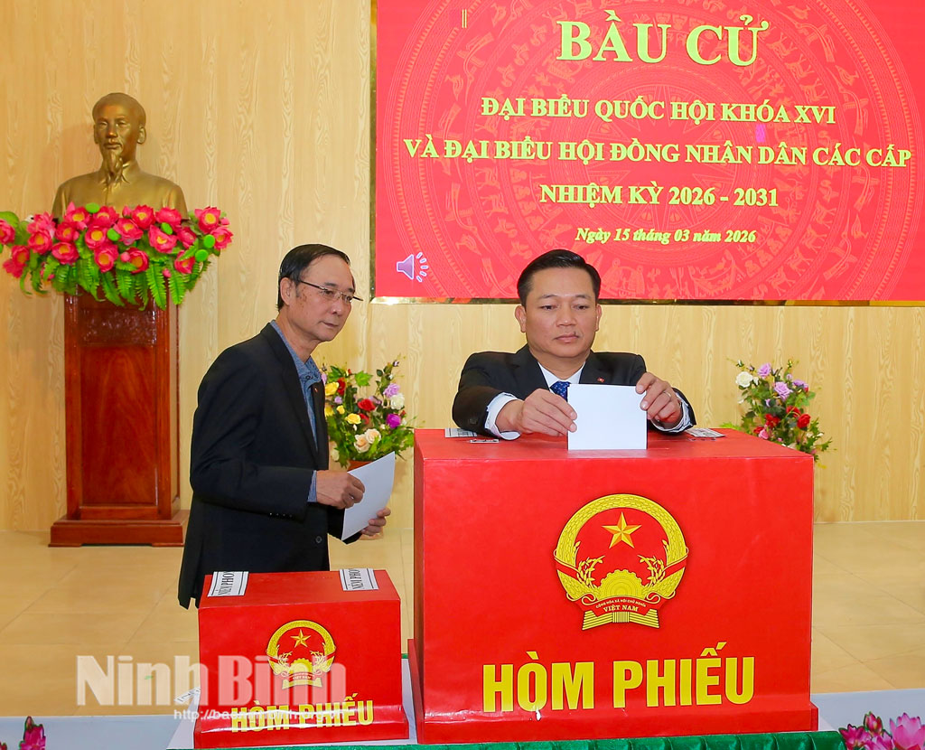 Đồng chí Mai Văn Tuất, Phó Bí thư Tỉnh ủy, Chủ tịch Ủy ban MTTQ Việt Nam tỉnh, Phó Trưởng Ban Chỉ đạo Cuộc bầu cử tỉnh bỏ phiếu bầu cử tại Khu vực bỏ phiếu số 32, phường Hoa Lư.