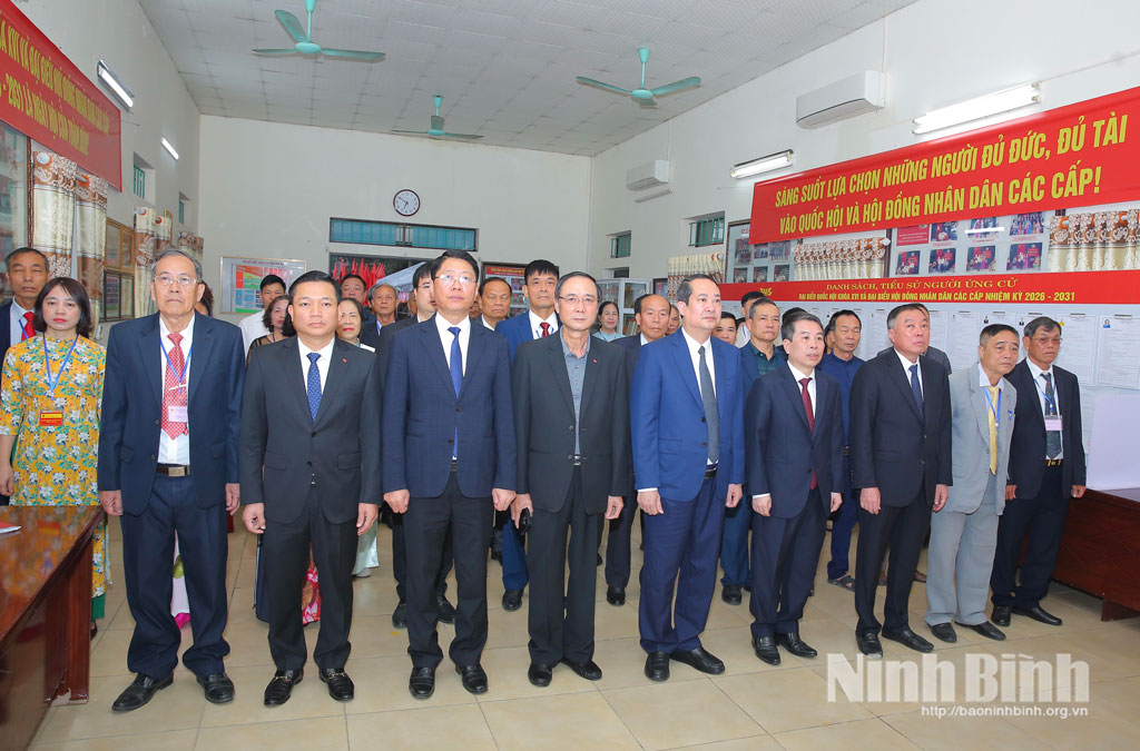 Dự lễ khai mạc và thực hiện quyền công dân tại Khu vực bỏ phiếu số 32, phường Hoa Lư có các đồng chí: Mai Văn Tuất, Phó Bí thư Tỉnh ủy, Chủ tịch Ủy ban Mặt trận Tổ quốc Việt Nam tỉnh, Phó Trưởng Ban Chỉ đạo Cuộc bầu cử tỉnh; Nguyễn Tiến Thành, nguyên Phó Bí thư Thường trực Tỉnh ủy, nguyên Chủ tịch HĐND tỉnh; các đồng chí Ủy viên Ban Thường vụ Tỉnh ủy: Bùi Hoàng Hà, Phó Chủ tịch Thường trực HĐND tỉnh; Trần Song Tùng, Phó Chủ tịch Thường trực UBND tỉnh; Đinh Văn Tiên, Giám đốc Sở Nông nghiệp và Môi trường; đồng chí Nguyễn Cao Sơn, Tỉnh ủy viên, Phó Chủ tịch UBND tỉnh cùng đông đảo cử tri trên địa bàn phố Mía Đông, phố Khánh Minh, phố Kim Đa, phường Hoa Lư.