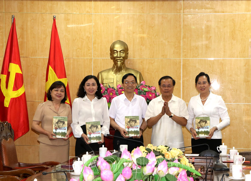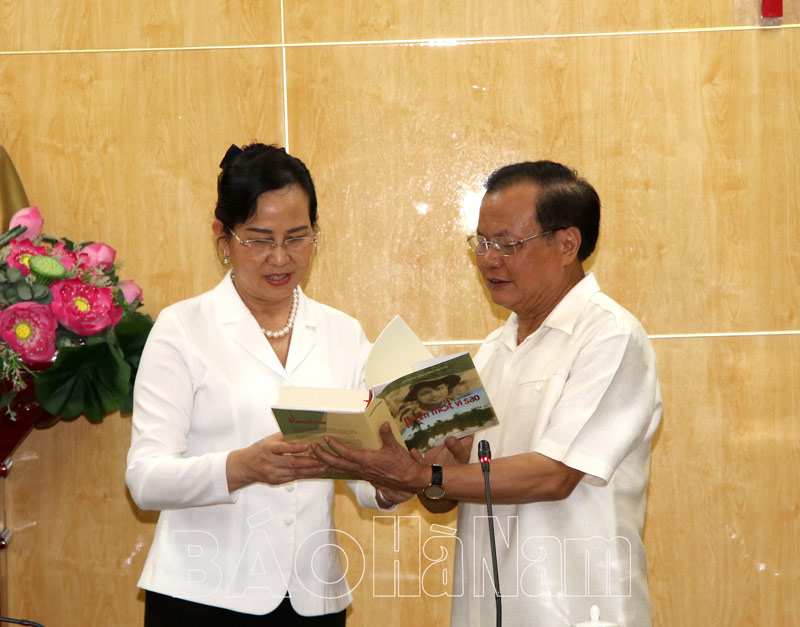 Đồng chí Phạm Quang Nghị giới thiệu cuốn sách với đồng chí Lê Thị Thủy, trong đó có 50 trang viết về những năm tháng đồng chí công tác tại Hà NamĐồng chí Phạm Quang Nghị tặng sách cho các đồng chí lãnh đạo tỉnh Hà Nam