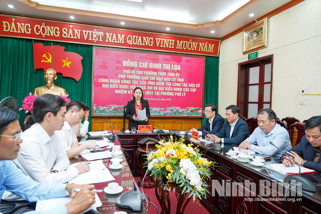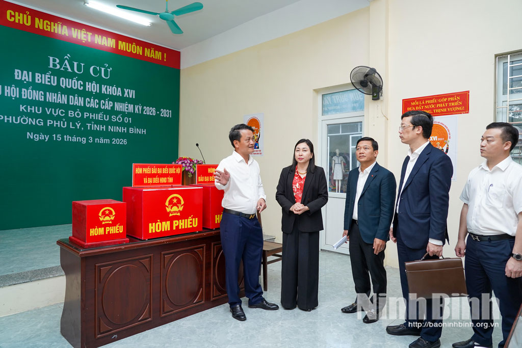 Tại phường Phủ Lý, Đoàn đã đi kiểm tra thực tế công tác chuẩn bị bầu cử tại khu vực bỏ phiếu số 01; nghe Ban Chỉ đạo cuộc bầu cử phường báo cáo tình hình chuẩn bị bầu cử ĐBQH khoá XVI và đại biểu HĐND các cấp nhiệm kỳ 2026- 2031. Tiếp và làm việc với đoàn kiểm tra của Ban Chỉ đạo cuộc bầu cử tỉnh có đồng chí Đào Đình Tùng, Ủy viên Ban Thường vụ Tỉnh ủy, Bí thư Đảng ủy, Chủ tịch HĐND phường Phủ Lý.