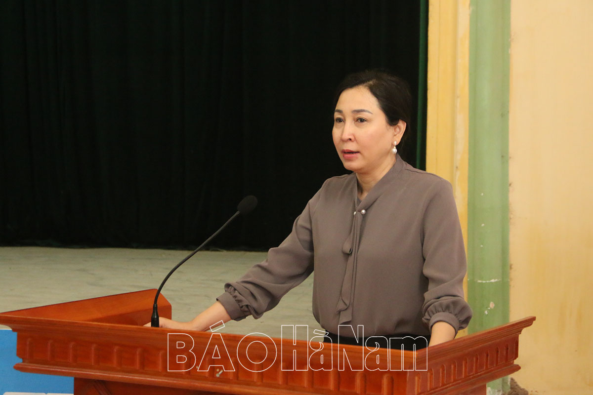 Đồng chí Đinh Thị Lụa, Phó Bí thư Thường trực Tỉnh ủy, Phó Trưởng BCĐ phòng, chống dịch Covid -19 tỉnh phát biểu tại buổi kiểm tra tại xã Đạo Lý (Lý Nhân).
