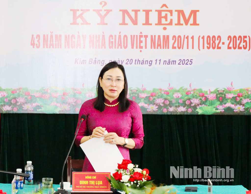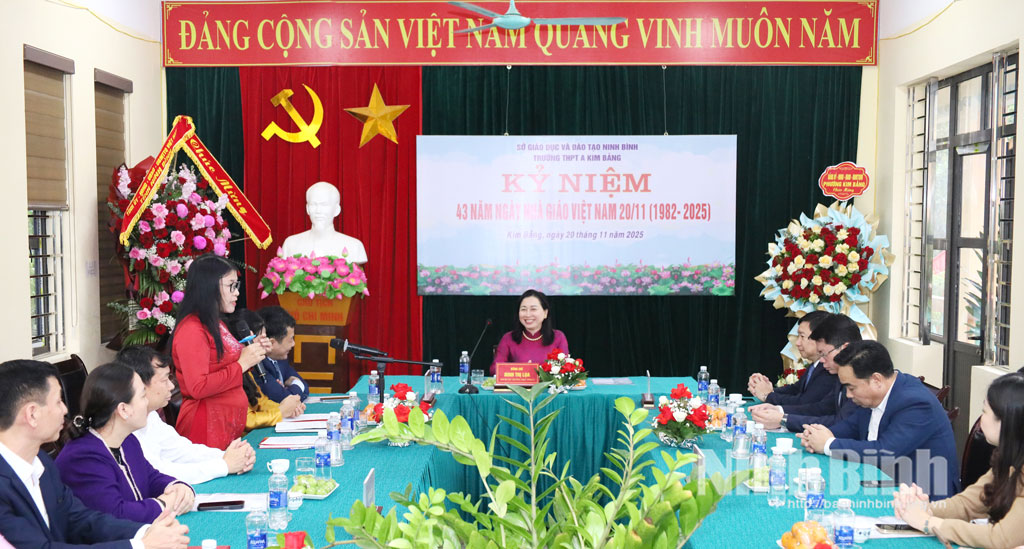 Chiều 18/11, đồng chí Đinh Thị Lụa, Phó Bí thư Thường trực Tỉnh ủy đã đến thăm và chúc mừng Trường THPT A Kim Bảng, phường Kim Bảng nhân dịp kỷ niệm 43 năm Ngày Nhà giáo Việt Nam (20/11/1982-20/11/2025). Cùng dự có đồng chí Nguyễn Tiến Dũng, Tỉnh ủy viên, Giám đốc Sở Giáo dục và Đào tạo.