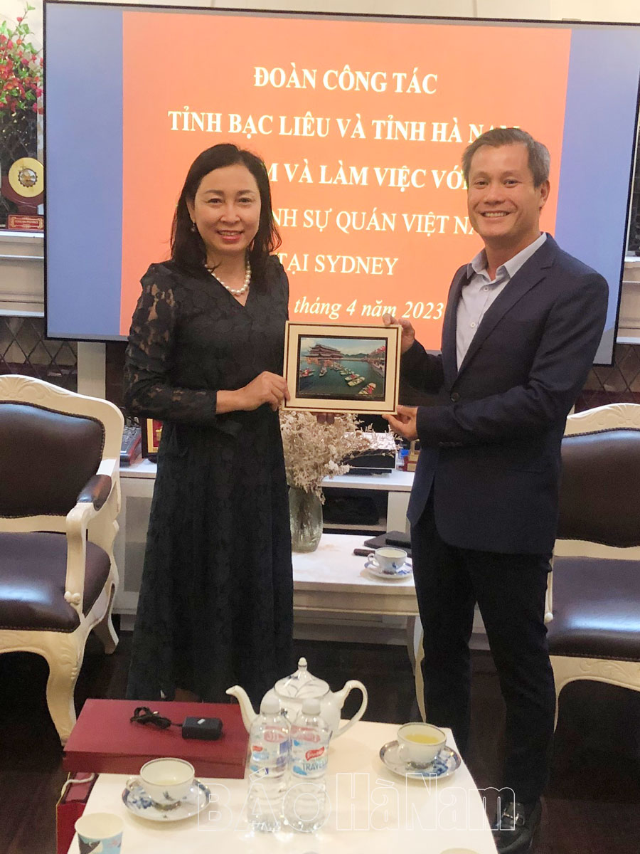 Đồng chí Phó Bí thư Thường trực Tỉnh ủy Đinh Thị Lụa trao quà lưu niệm của Tỉnh ủy Hà Nam tặng Tổng Lãnh sự quán Việt Nam tại Sydney.