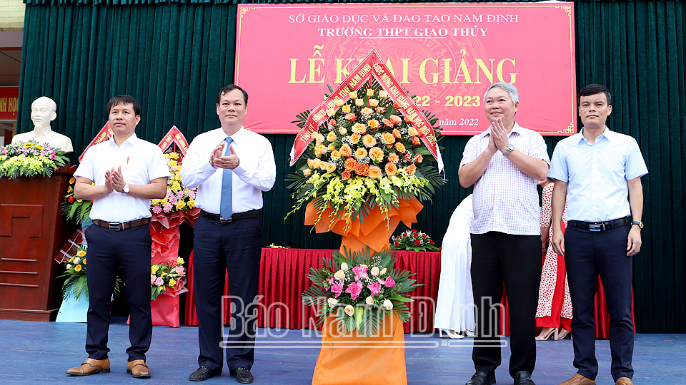| Đồng chí Phó Bí thư Thường trực Tỉnh ủy Lê Quốc Chỉnh tặng lẵng hoa tươi thắm chúc mừng thầy và trò Trường THPT Giao Thủy nhân dịp năm học mới 2022-2023. |