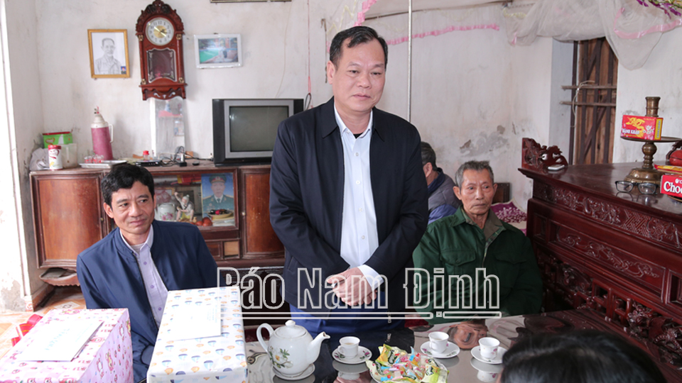 | Đồng chí Lê Quốc Chỉnh, Phó Bí thư Thường trực Tỉnh ủy, Chủ tịch HĐND tỉnh, Trưởng đoàn Đoàn đại biểu Quốc hội tỉnh phát biểu chúc Tết các gia đình đối tượng chính sách, người có công tại huyện Vụ Bản. |