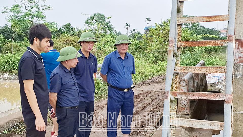 | Đồng chí Phó Bí thư Thường trực Tỉnh ủy Lê Quốc Chỉnh; lãnh đạo Thành ủy, UBND thành phố Nam Định kiểm tra tại cống kênh xả Trạm bơm Quán Chuột. |