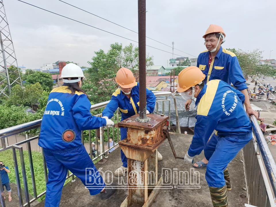 | Công nhân Công ty Cổ phần Công trình đô thị Nam Định mở cánh phai cống Trạm bơm Quán Chuột phục vụ tiêu thoát nước. |