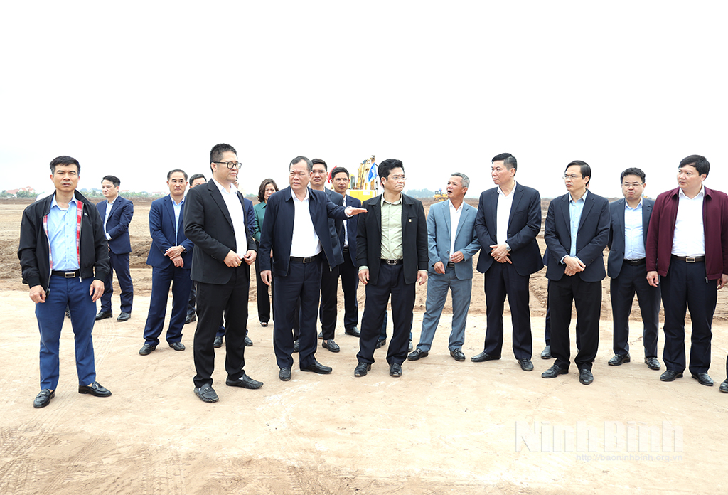 Đồng chí Lê Quốc Chỉnh, Phó Bí thư Tỉnh ủy, Chủ tịch HĐND tỉnh và Đoàn công tác kiểm tra, động viên sản xuất tại Dự án Nhà máy Thép Xanh số 1 Xuân Thiện Nam Định, xã Nghĩa Lâm.