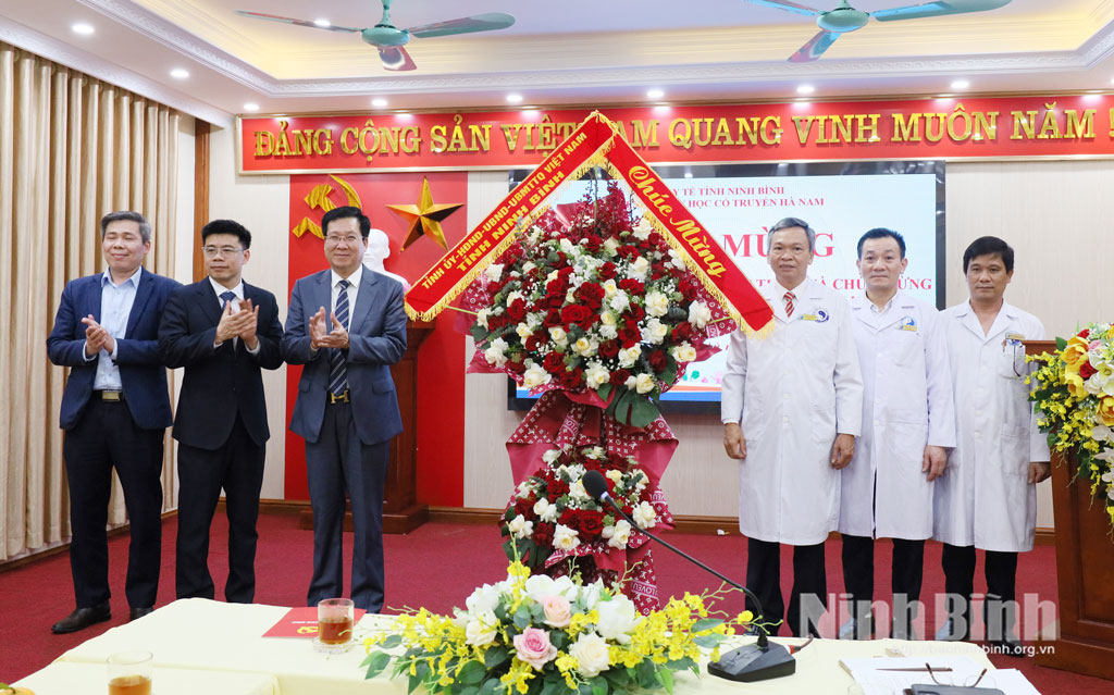 Đồng chí Lê Xuân Huy, Tỉnh ủy viên, Phó Chủ tịch HĐND tỉnh tặng hoa chúc mừng Bệnh viện Y học cổ truyền Hà Nam nhân Ngày Thầy thuốc Việt Nam 27/2.