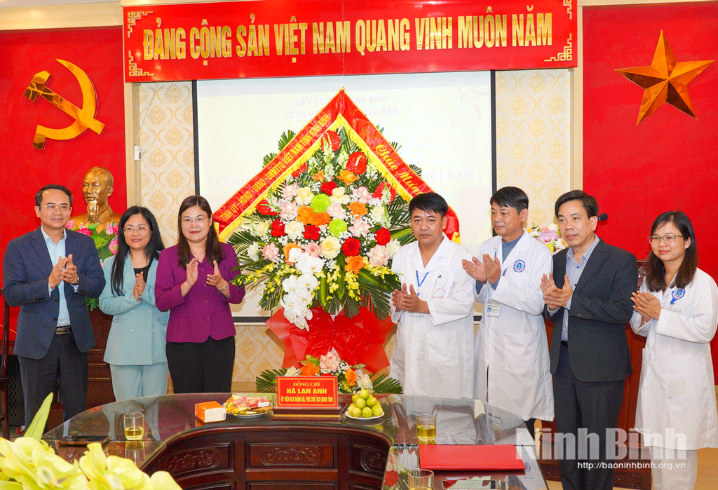 Đồng chí Hà Lan Anh, Tỉnh uỷ viên, Phó Chủ tịch UBND tỉnh và đoàn công tác của tỉnh tặng hoa chúc mừng tập thể cán bộ, viên chức, người lao động Bệnh viện Đa khoa Vụ Bản.