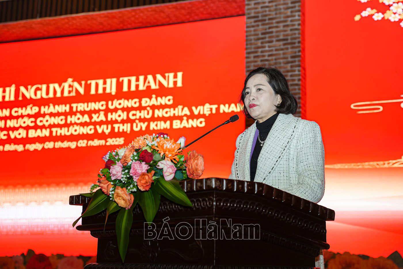Phát biểu tại chương trình làm việc, đồng chí Phó Chủ tịch Quốc hội Nguyễn Thị Thanh ghi nhận, đánh giá cao những thành tựu mà Đảng bộ, chính quyền và nhân dân Hà Nam đạt được trong phát triển kinh tế - xã hội, quốc phòng, an ninh với nhiều đột phá: Kinh tế tiếp tục tăng trưởng khá, an ninh chính trị, trật tự an toàn xã hội được giữ vững, đời sống nhân dân ngày càng được nâng cao; an sinh xã hội được quan tâm thực hiện.Đồng chí cũng khẳng định, trong sự phát triển chung đó có sự đóng góp không nhỏ của Đảng bộ, chính quyền và nhân dân thị xã Kim Bảng. Với sự cố gắng, nỗ lực, đoàn kết, đồng lòng, BTV Thị ủy, BCH Đảng bộ thị xã Kim Bảng đã lãnh đạo, chỉ đạo, tổ chức thực hiện và hoàn thành thắng lợi các nhiệm vụ phát triển kinh tế - xã hội. Đồng chí khẳng định: được Ủy ban Thường vụ Quốc hội công nhận thị xã ngay trong những ngày đầu xuân mới- đó là niềm vui, niềm tự hào và cũng là trách nhiệm lớn lao mà Đảng bộ, chính quyền nhân dân thị xã phải nỗ lực phấn đấu xây dựng quê hương sao cho xứng tầm với sự phát triển. Chúc mừng những thành tựu mà Đảng bộ, chính quyền và nhân dân thị xã Kim Bảng đạt được, đồng chí Phó Chủ tịch Quốc hội bày tỏ mong BTV Thị ủy, BCH Đảng bộ thị xã Kim Bảng tiếp tục phát huy tinh thần đoàn kết, thống nhất, tập trung lãnh đạo, chỉ đạo, tổ chức thực hiện thắng lợi toàn diện nhiệm vụ chính trị, đưa địa phương phát triển nhanh, bền vững hơn nữa, phấn đấu trở thành đô thị loại III vào năm 2030.