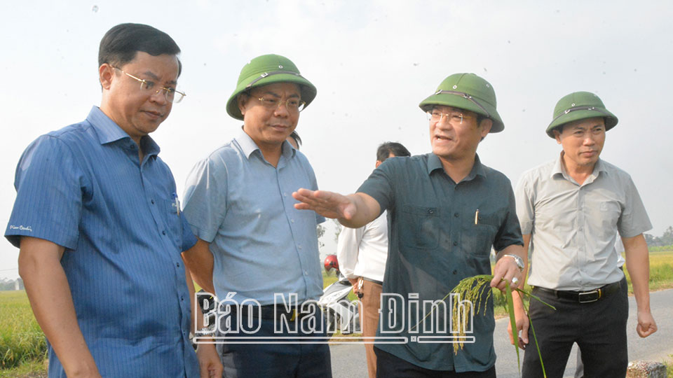 | Đồng chí Trần Anh Dũng, Ủy viên Ban TVTU, Phó Chủ tịch Thường trực UBND tỉnh kiểm tra lúa mùa tại xã Thành Lợi (Vụ Bản). |