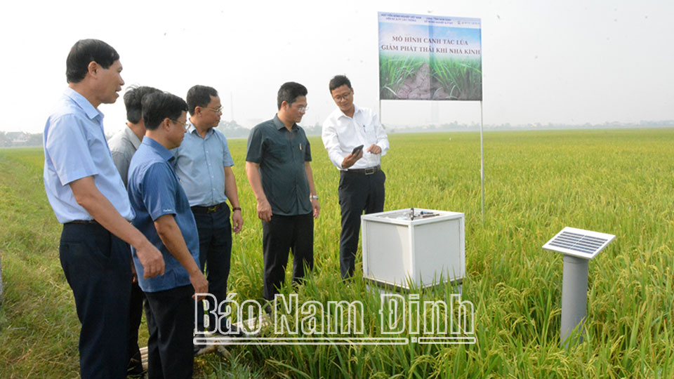 | Đồng chí Phó Chủ tịch Thường trực UBND tỉnh Trần Anh Dũng kiểm tra mô hình "Canh tác lúa tiết kiệm nước, tạo tín chỉ carbon trong canh tác lúa bền vừng tại tỉnh Nam Định" tại cánh đồng xã Yên Khang (Ý Yên). |