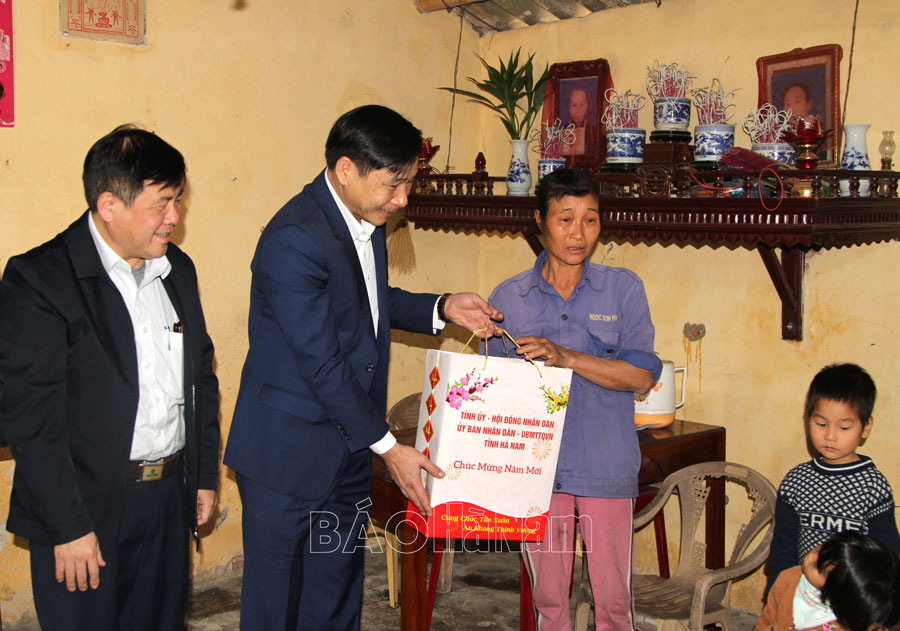 Thừa ủy quyền của Chủ tịch nước, thay mặt lãnh đạo tỉnh đồng chí Nguyễn Anh Chức đã trao lụa, tặng quà cho cụ Trần Thị Nuôi, trao quà của tỉnh cho Mẹ Việt Nam Anh hùng Trần Thị Chắt, bệnh binh Trương Công Thuấn và cháu Lê Văn Tuấn Kiệt. Đồng chí gửi lời chúc sức khỏe, hạnh phúc đến các gia đình nhân dịp năm mới. Đồng thời, lưu ý các cấp ủy, chính quyền địa phương tiếp tục quan tâm chăm lo cho các gia đình chính sách, người có hoàn cảnh khó khăn và mong muốn các gia đình tiếp tục phát huy truyền thống, ý chí tự lực tự cường, gương mẫu dạy bảo con cháu, cần cù lao động để cùng địa phương xây dựng huyện Bình Lục ngày càng giàu đẹp, văn minh.