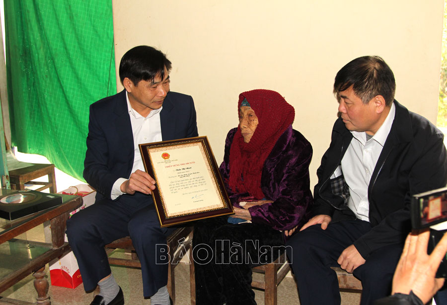 Đồng chí Phó Chủ tịch Thường trực UBND tỉnh Nguyễn Anh Chức thay mặt Chủ tịch nước thăm, tặng lụa cho cụ Trần Thị Nuôi tròn 100 tuổi.