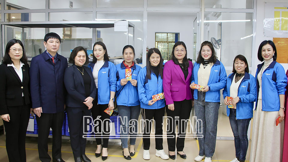 | Đồng chí Phó Chủ tịch UBND tỉnh Hà Lan Anh tặng quà, động viên công nhân Công ty Cổ phần may Nam Định nỗ lực thi đua, nâng cao hiệu quả sản xuất trong năm 2024. |