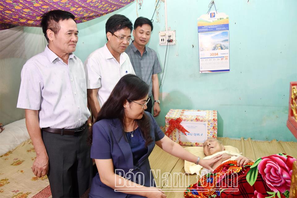 Ðồng chí Phó Chủ tịch UBND tỉnh và Đoàn đã đến thăm, tặng quà Mẹ Việt Nam Anh hùng Trần Thị Yên, 102 tuổi, ở tổ dân phố Lương Thế Vinh, thị trấn Gôi; thương binh Trần Trọng Căn, 84 tuổi, ở tổ dân phố Vân Côi, thị trấn Gôi.
