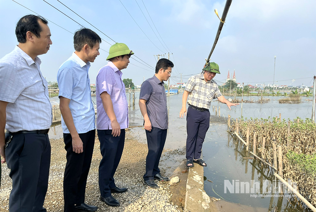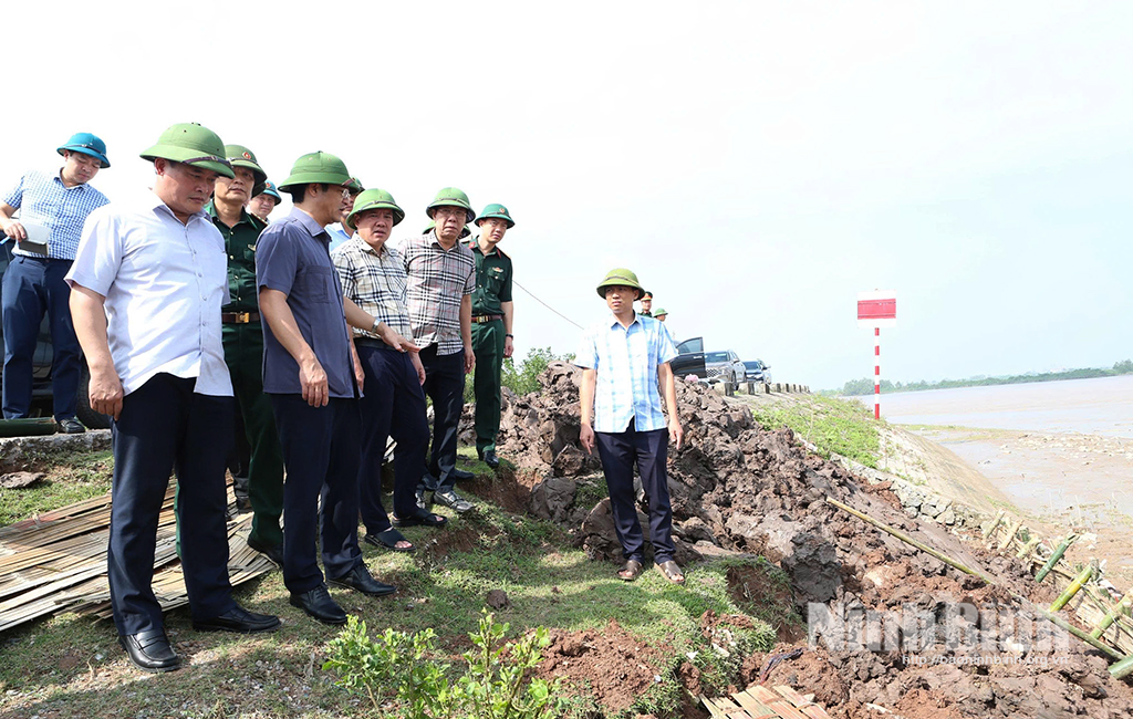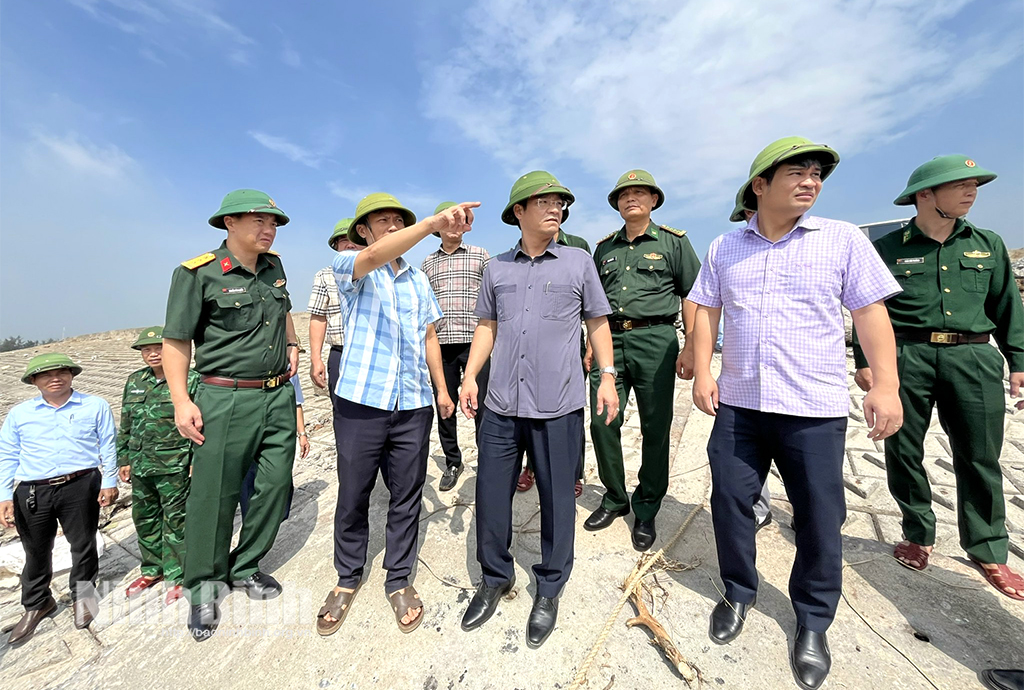 Đồng chí Phó Chủ tịch UBND tỉnh Trần Anh Dũng và Đoàn đã trực tiếp kiểm tra tại một số trọng điểm xung yếu, gồm: đê bối Hồng Hà (phường Thiên Trường); sự cố tuyến đê biển thuộc địa bàn xã Giao Ninh; tình trạng sạt lở mái đê cửa sông Hồng, đê biển xã Giao Minh và công tác khắc phục sự cố tuyến đê biển Hải Thịnh III (xã Hải Thịnh).