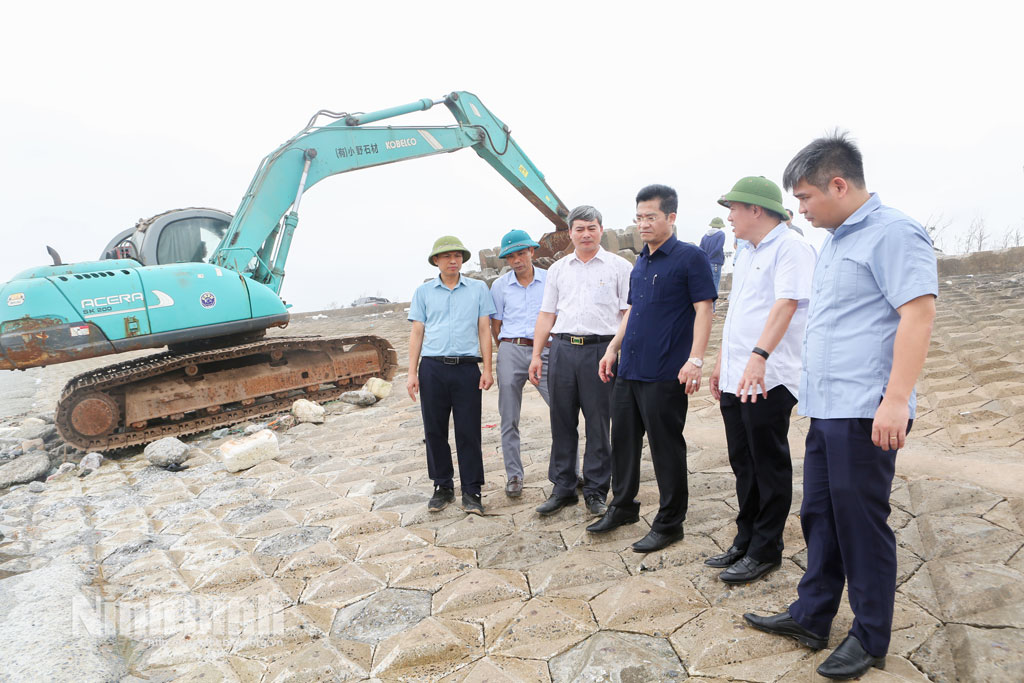 Đồng chí Trần Anh Dũng, Ủy viên Ban Thường vụ Tỉnh ủy, Phó Chủ tịch UBND tỉnh và đoàn công tác kiểm tra khu vực đê, kè Hải Thịnh III.