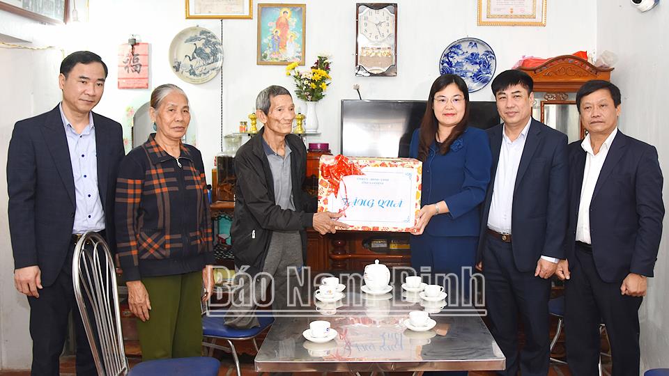 | Đồng chí Phó Chủ tịch UBND tỉnh Hà Lan Anh chúc Tết, tặng quà ông Vũ Viết Lâm là thương binh nặng và bị nhiễm chất độc hóa học, ở xóm Đồng Bái, xã Đồng Sơn (Nam Trực). |