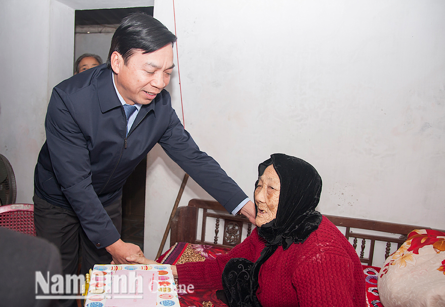 | Đồng chí Trần Văn Chung, Phó Bí thư Thường trực Tỉnh ủy, Chủ tịch HĐND tỉnh thăm, chúc Tết, tặng quà Bà mẹ Việt Nam Anh hùng Phạm Thị Nhâm (92 tuổi), xóm 1, xã Hải Hưng. |