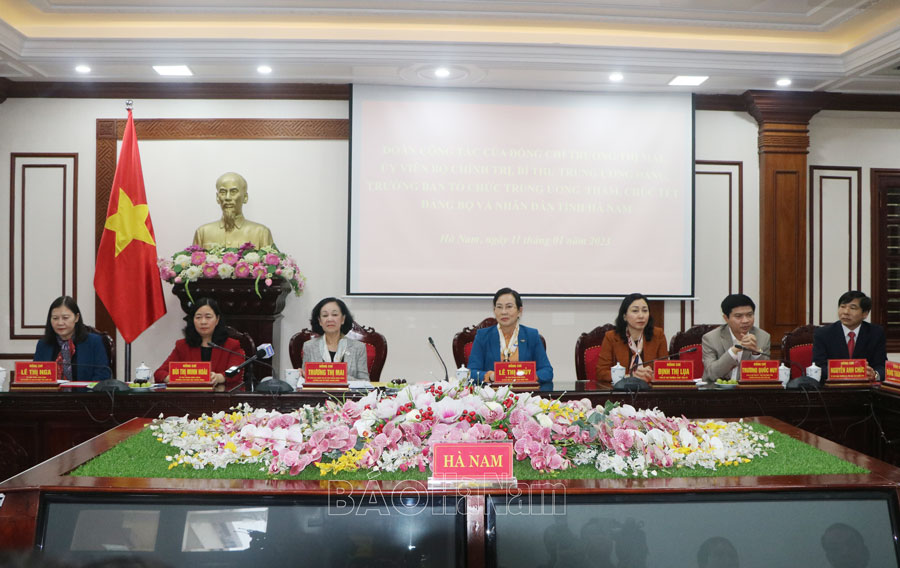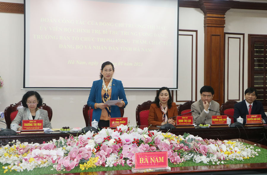 Thay mặt lãnh đạo Đảng, Nhà nước, đồng chí Trưởng Ban Tổ chức Trung ương Trương Thị Mai chúc Đảng bộ, chính quyền và nhân dân tỉnh Hà Nam đón Tết an toàn, đầm ấm, yên vui, hạnh phúc, thành công. Đồng thời, mong muốn Đảng bộ, chính quyền, lực lượng vũ trang và nhân dân tỉnh Hà Nam tiếp tục phát huy truyền thống đoàn kết, khắc phục những mặt còn hạn chế, thực hiện thắng lợi các mục tiêu mà Nghị quyết Đại hội XIII của Đảng, Nghị quyết Đại hội XX Đảng bộ tỉnh đề ra, đưa Hà Nam tiếp tục phát triển.