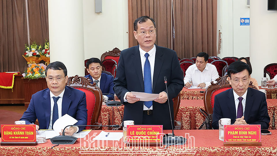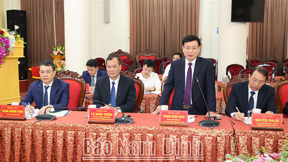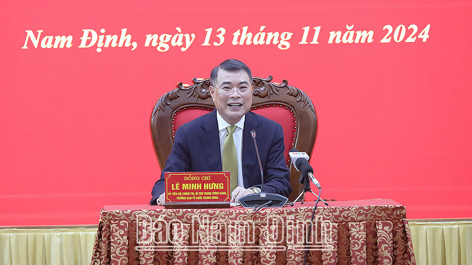 Phát biểu chỉ đạo tại buổi làm việc, đồng chí Trưởng Ban Tổ chức Trung ương Lê Minh Hưng đánh giá cao kết quả tỉnh Nam Định đạt được thời gian qua. Đồng thời nhấn mạnh nhiệm vụ trọng tâm của tỉnh thời gian tới, tiếp tục nâng cao chất lượng công tác xây dựng Đảng và hệ thống chính trị; thúc đẩy phát triển kinh tế - xã hội nhanh, bền vững; bảo đảm quốc phòng - an ninh. Trước mắt, tỉnh cần tập trung làm tốt công tác chuẩn bị tổ chức đại hội đảng bộ các cấp, tiến tới Đại hội đại biểu toàn quốc lần thứ XIV của Đảng; đặc biệt chú trọng công tác xây dựng Văn kiện Đại hội Đảng bộ tỉnh nhiệm kỳ mới theo hướng quyết tâm nâng cao chất lượng; đặt ra mục tiêu phải có tính khả thi cao; chỉ ra đường lối phát triển nhưng phải có giải pháp cụ thể kèm theo nguồn lực để thực hiện. Tỉnh cần chú trọng đổi mới, sáng tạo; tiếp tục tinh gọn bộ máy theo chỉ đạo của Trung ương; không ngừng nâng cao chất lượng nguồn nhân lực tại chỗ; chú trọng công tác phát triển đảng viên mới. Phát huy những cách làm hay, sáng tạo trong xây dựng Đảng, phát triển kinh tế, huy động sức mạnh từ các tôn giáo, góp phần tích cực vào sự phát triển chung của tỉnh…