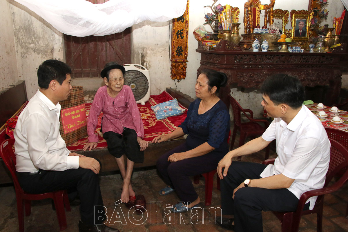 Cũng trong buổi chiều 15/4, đồng chí Chủ tịch UBND tỉnh và Đoàn công tác của tỉnh, Thành phố Phủ Lý đã tới thăm gia đình liệt sĩ Nguyễn Văn Nhật, Phường Liêm Chính; bà Nguyễn Thị Mý - dân công hoả tuyến ở phường Liêm Chính; ông Đỗ Văn Lý, chiến sĩ Điện Biên tại xã Châu Sơn; ông Nguyễn Văn Nghĩa, Phường Lê Hồng Phong - là chiến sĩ Điện Biên.