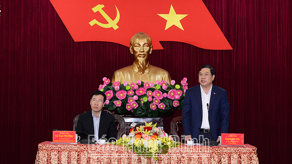 | Các đồng chí Võ Văn Thưởng, Ủy viên Bộ Chính trị, Thường trực Ban Bí thư Trung ương Đảng và Phạm Gia Túc, Ủy viên BCH Trung ương Đảng, Bí thư Tỉnh ủy chủ trì buổi làm việc. |