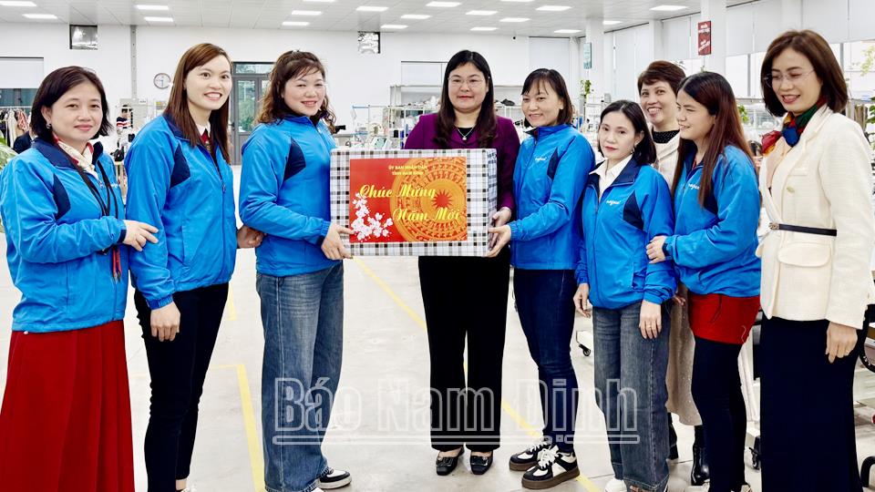 | Đồng chí Phó Chủ tịch UBND tỉnh Hà Lan Anh tặng quà, động viên công nhân Công ty Cổ phần may Nam Định nỗ lực thi đua, nâng cao hiệu quả sản xuất trong năm 2025. |