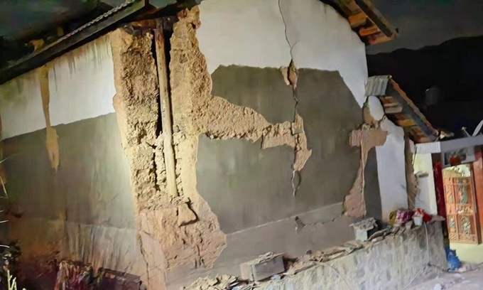 Tường nhà bị nứt sau động đất ở Vân Nam hôm 21/5. Ảnh: Xinhua.