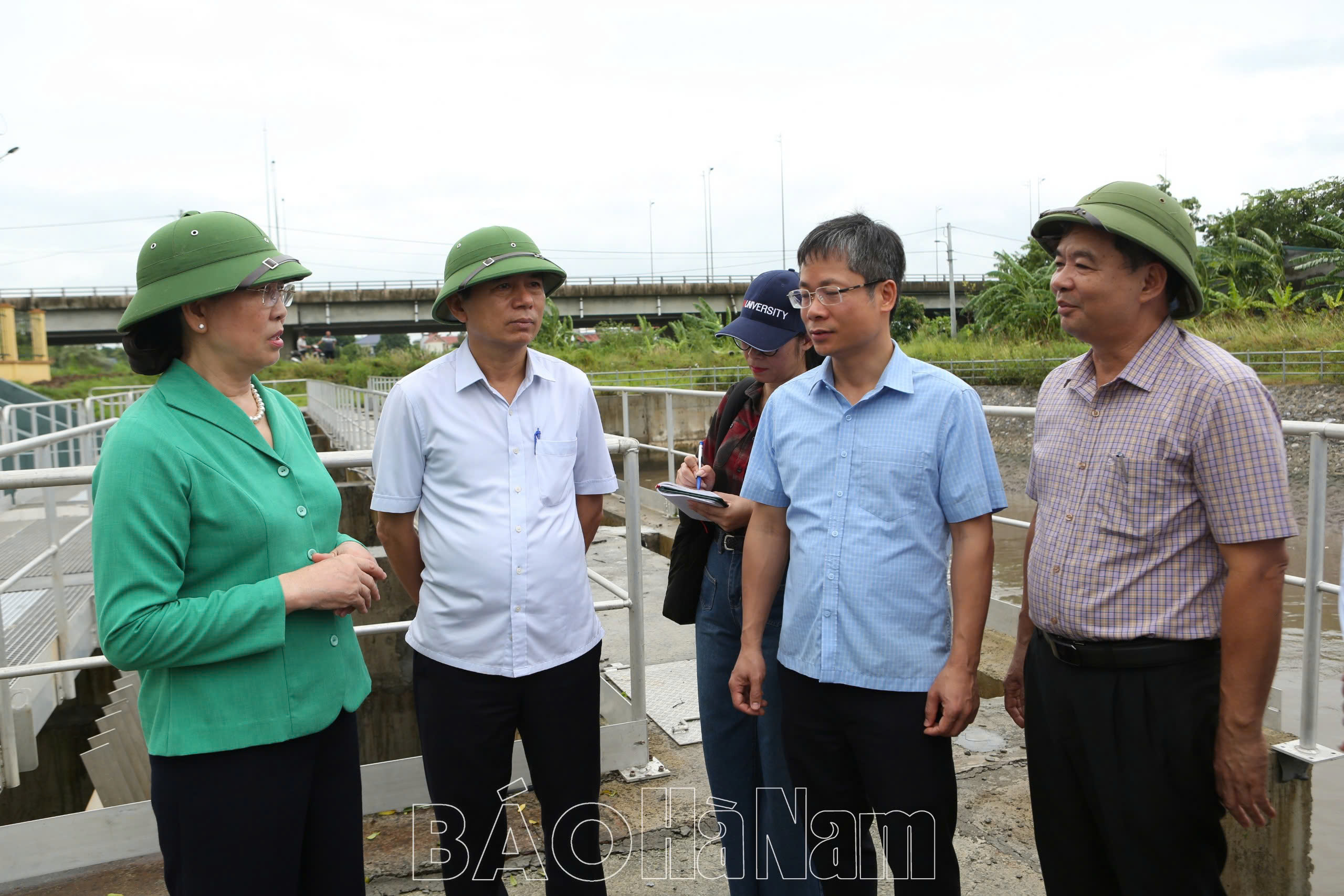 Đồng chí Bí thư Tỉnh ủy Lê Thị Thủy kiểm tra tại trạm bơm Triệu Xá (thành phố Phủ Lý).