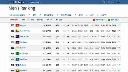 ĐT bóng đá nam quốc gia vươn lên hạng 133 thế giới