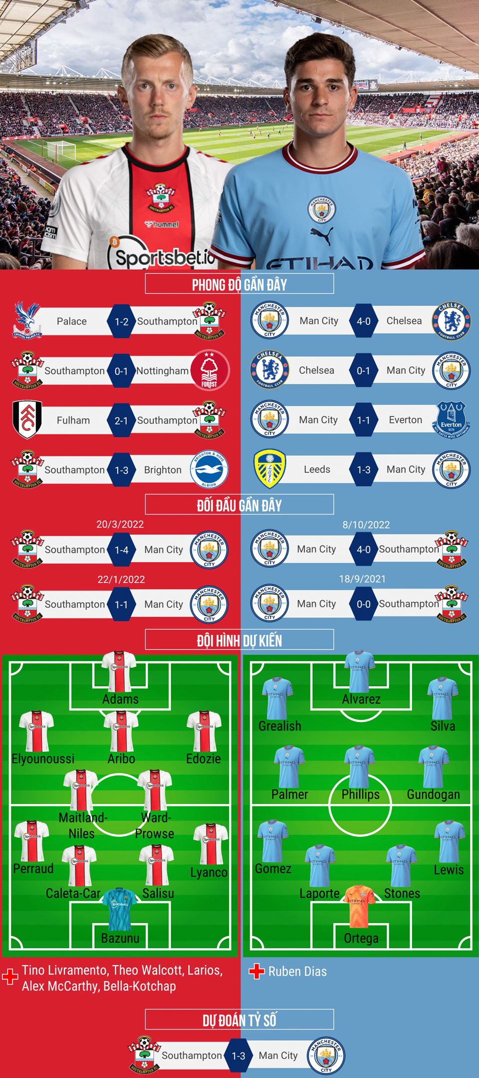 Dự đoán tỷ số, đội hình xuất phát trận Southampton - Man City