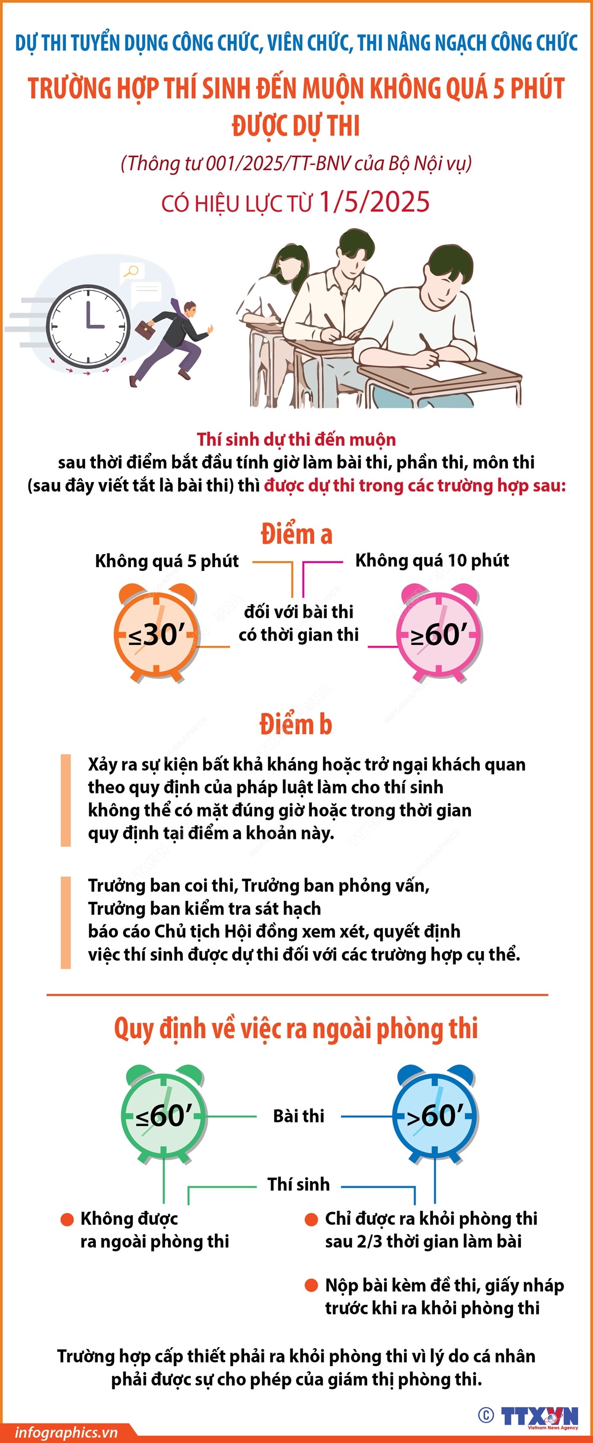 Theo khoản 1 Điều 1 Thông tư 001/2025/TT-BNV ngày 17/3/2025 của Bộ Nội vụ, từ ngày 1/5/2025, thí sinh dự thi tuyển dụng công chức, viên chức, thi nâng ngạch công chức phải có mặt tại phòng thi đúng giờ quy định.