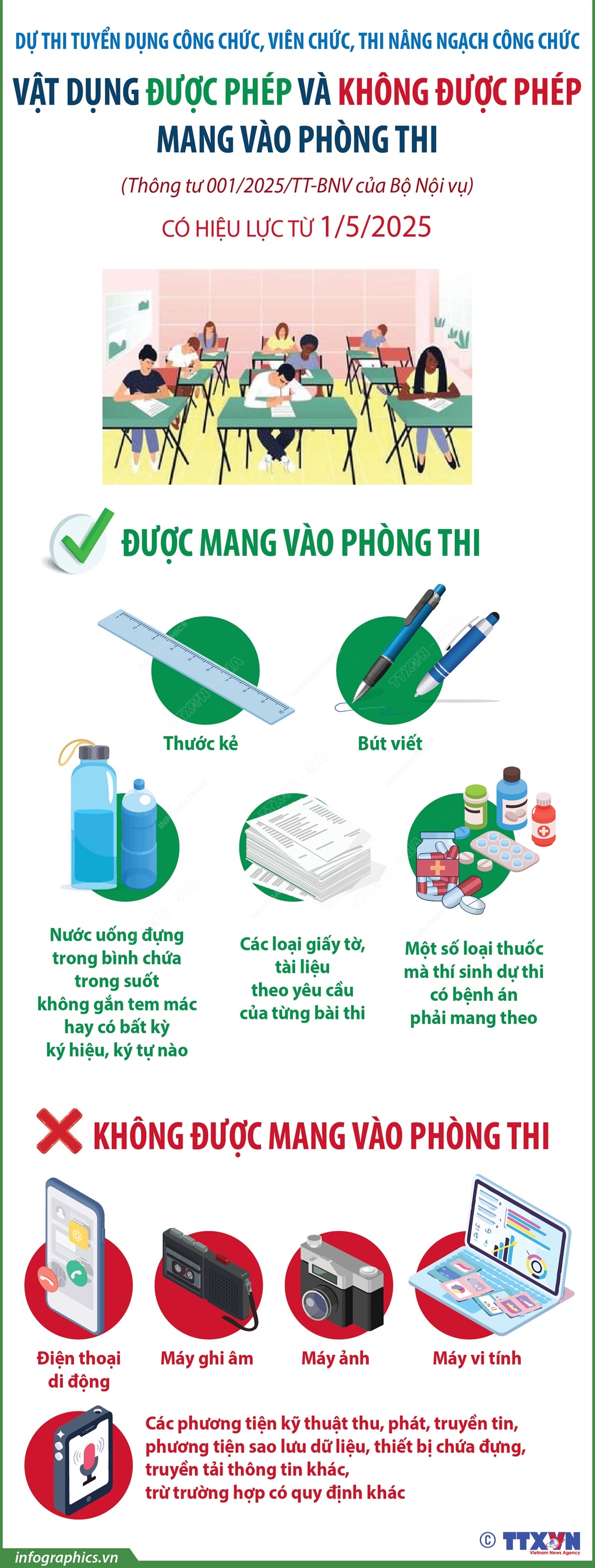 Cũng theo khoản 1 Điều 1 Thông tư 001/2025/TT-BNV ngày 17/3/2025 của Bộ Nội vụ, từ ngày1/5/2025, thí sinh dự thi tuyển dụng công chức, viên chức, thi nâng ngạch công chức không được mang vào phòng thi điện thoại di động, máy ghi âm, máy ảnh, máy vi tính; các phương tiện kỹ thuật thu, phát, truyền tin, phương tiện sao lưu dữ liệu, thiết bị chứa đựng, truyền tải thông tin khác, trừ trường hợp có quy định khác.