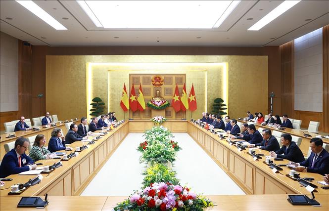Nhận lời mời của Thủ tướng Chính phủ nước Cộng hòa xã hội chủ nghĩa Việt Nam Phạm Minh Chính, Thủ tướng Vương quốc Tây Ban Nha Pedro Sánchez đã có chuyến thăm chính thức Việt Nam từ ngày 8 - 10/4/2025. Ngay sau Lễ đón chính thức trọng thể, sáng 9/4 tại Trụ sở Chính phủ, Thủ tướng Chính phủ Phạm Minh Chính đã hội đàm với Thủ tướng Pedro Sánchez.