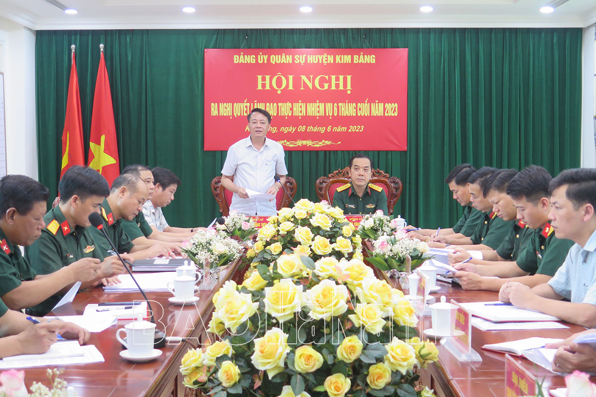*Chiều 8/6, Đảng ủy Quân sự (ĐUQS) huyện Kim Bảng cũng đã tổ chức hội nghị ra nghị quyết lãnh đạo triển khai nhiệm vụ 6 tháng cuối năm. Đại tá Lường Văn Thắng, Ủy viên BTV Tỉnh ủy, Chỉ huy trưởng Bộ CHQS tỉnh dự, chỉ đạo. Đồng chí Phạm Hồng Sơn, TUV, Bí thư Huyện uỷ, Bí thư ĐUQS huyện chủ trì hội nghị.