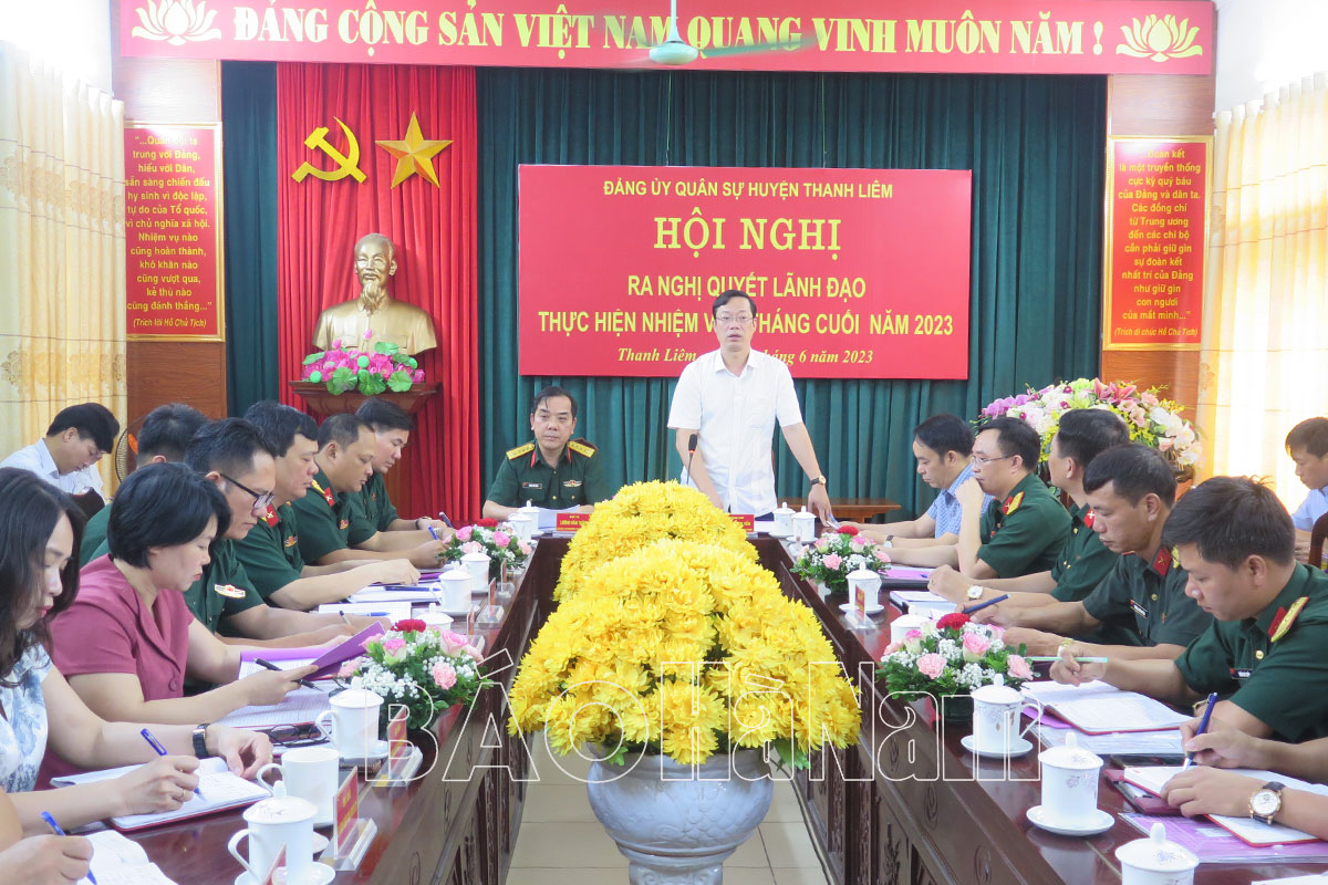 Sáng 8/6, Đảng ủy Quân sự (ĐUQS) huyện Thanh Liêm tổ chức hội nghị ra nghị quyết lãnh đạo thực hiện nhiệm vụ 6 tháng cuối năm 2023. Đại tá Lường Văn Thắng, Ủy viên BTV Tỉnh ủy, Chỉ huy trưởng Bộ CHQS tỉnh dự, chỉ đạo hội nghị. Đồng chí Nguyễn Minh Tiến, Bí thư Huyện uỷ, Bí thư ĐUQS huyện Thanh Liêm chủ trì hội nghị.